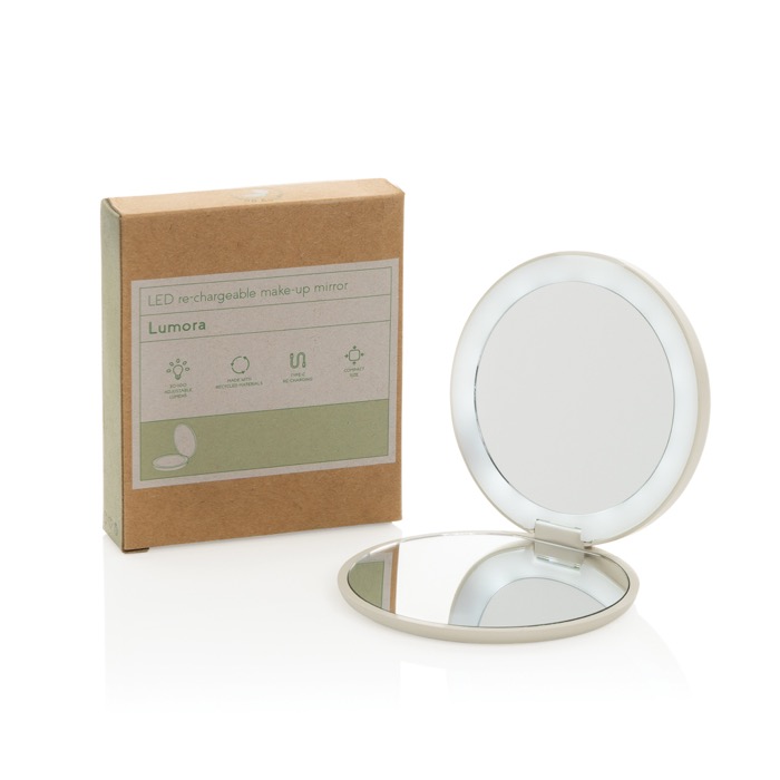 Un espejo de bolsillo en plástico reciclado con aumento y luz LED ofrece un compromiso sostenible y tecnología avanzada. Este accesorio innovador permite retoques precisos en cualquier lugar. Además, cuenta con iluminación LED integrada y un modo de luz ajustable para regular el brillo según tus necesidades. La batería recargable de 300 mAh se carga fácilmente mediante USB-C, asegurando comodidad y portabilidad. Fabricado con materiales reciclados certificados RCS, incluyendo un 46 % de plástico reciclado, y libre de PVC, refuerza la percepción de tu empresa como moderna y consciente.
