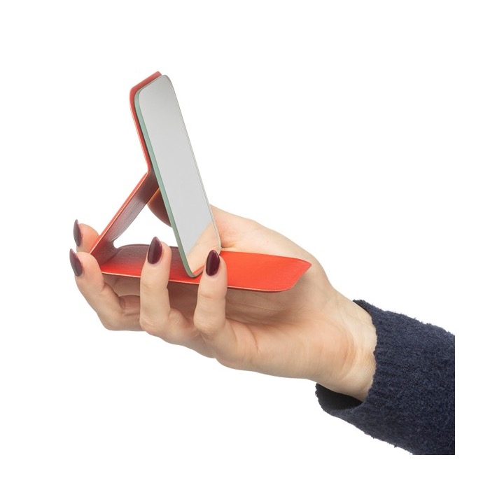 Espejo de cristal con tapa plegable de piel sintética reciclada, pensado para llevar en el bolso o en el bolsillo sin ocupar apenas espacio. Al abrirse, la tapa actúa como soporte para mantenerlo de pie y facilitar el uso sobre una mesa. El formato 70x11 cm ayuda a una visión alargada y cómoda, y está disponible en negro, blanco y rojo. Se entrega en bolsa de papel individual, útil para entregas en mano. Recomendado para acciones de marca en ferias y campañas de beauty o retail.