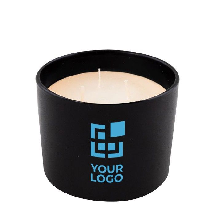 Vela de doble mecha fabricada en parafina y cera vegetal, con un 5% de fragancia, ideal para crear un ambiente acogedor en cualquier espacio corporativo. Disponible en tres elegantes fragancias: Ámbar con notas de Wood Sage & Sea Salt, Blanco con el aroma fresco de English Pear, y Negro con el toque profundo de Musk. Cada vela se presenta en una caja individual, facilitando su distribución y almacenamiento. Perfecta para iluminar salas de reuniones o como un detalle personalizado para clientes, al incluir su logotipo en el diseño.