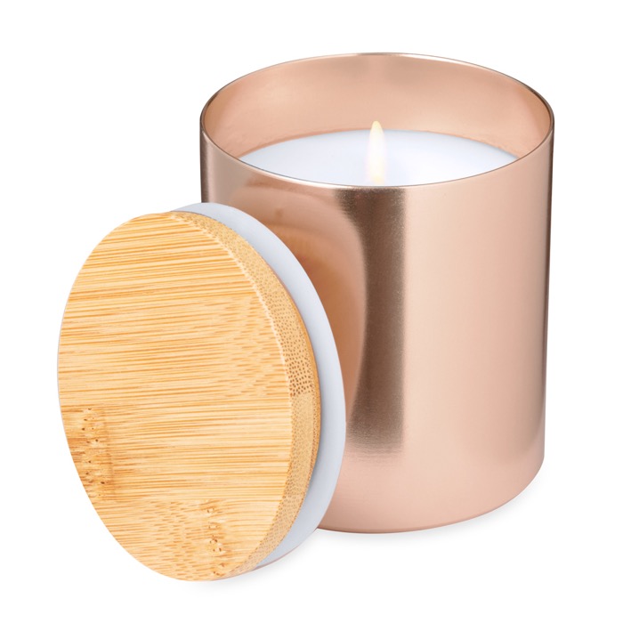 Vela con aroma a vanilla en tarro de metal con tapadera de bambú
