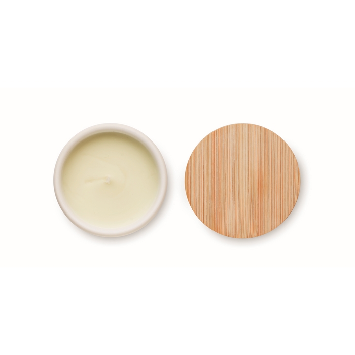 Vela aromática de cera vegetal en tarro de gres con tapa de bambú y base de corcho
