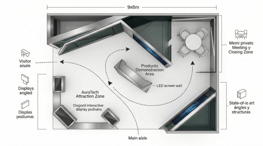 «Un plano arquitectónico profesional de la distribución de un stand de feria moderno de 9×6 metros. El diseño debe definir claramente tres zonas: una ‘zona de atracción’ amplia y abierta con podios de exhibición, una ‘área de demostración de producto’ central, y una ‘zona de cierre y reunión’ privada con una mesa redonda y 4 sillas. Incluir flechas sutiles que muestren el flujo de visitantes desde la entrada, circulando por las exhibiciones y guiando hacia el área de reunión. Estilo minimalista, etiquetas claras, líneas limpias y alto nivel de detalle.»