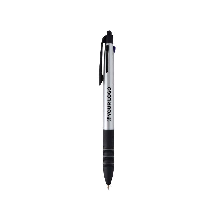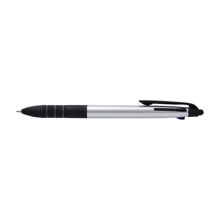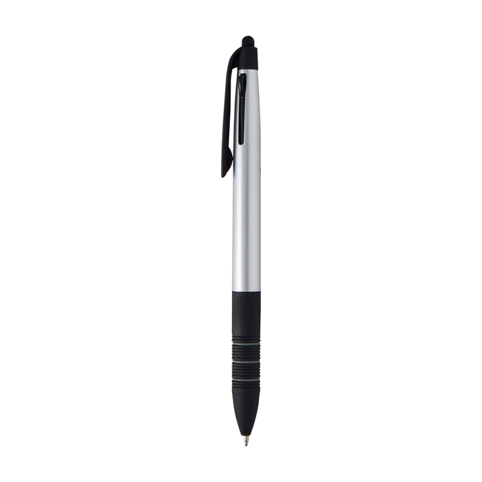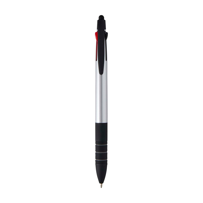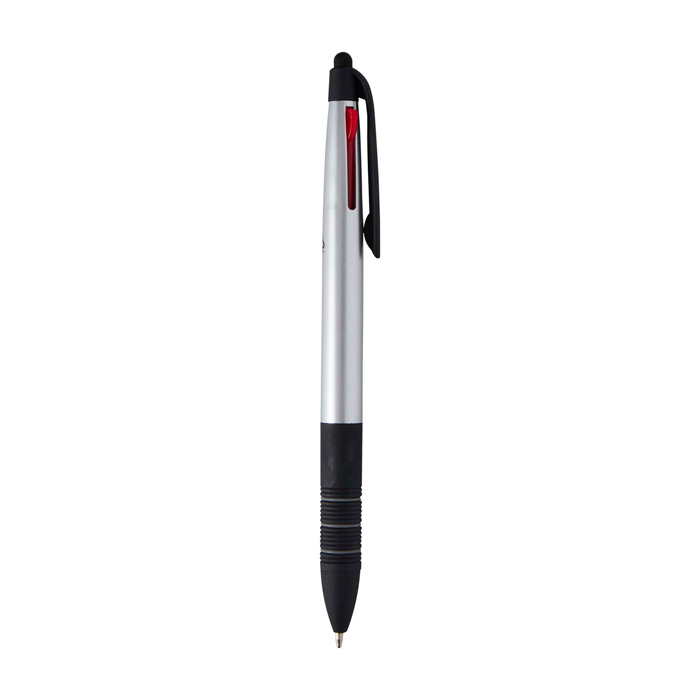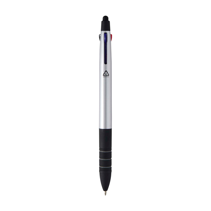 Bolígrafo 3 en 1 de plástico con certificado RCS (Recycled Claim Standard) y acabado metálico, pensado para alternar entre escritura y uso en pantalla. Incorpora punta stylus integrada para pantallas táctiles y un mecanismo deslizante que permite cambiar con rapidez entre tinta negra, azul y roja. La empuñadura ergonómica con caucho negro antideslizante y anillas grises mejora el agarre en el uso diario. Recomendable para acciones de marca en ferias, formaciones y entornos de oficina.