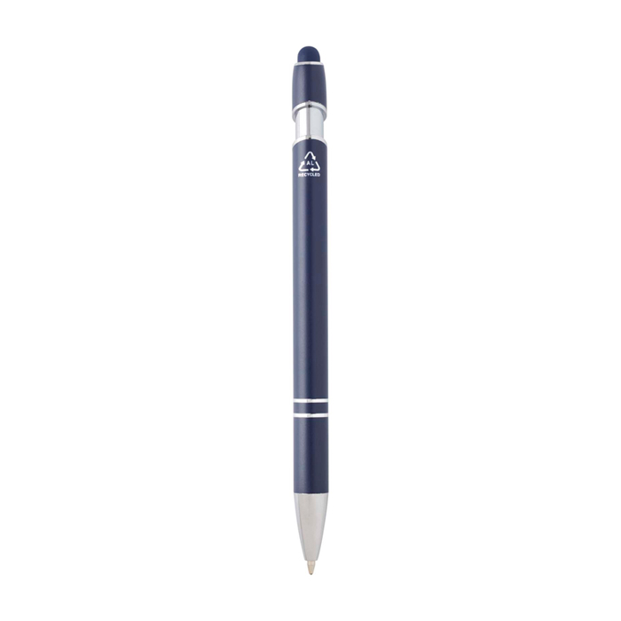 Un bolígrafo de aluminio reciclado con acabado plateado y tinta negra, combina sostenibilidad y estilo. El aluminio reciclado disminuye residuos y conserva recursos, reduciendo emisiones de gases de efecto invernadero. Incluye un lápiz táctil de silicona, convirtiéndolo en una herramienta versátil para el trabajo moderno. Su diseño elegante y escritura fluida, con una longitud de 800 metros y plumín de 1,0 mm, te permiten tomar notas y navegar en pantallas con facilidad. Es un obsequio que proyecta una imagen de marca innovadora y comprometida con el medio ambiente.