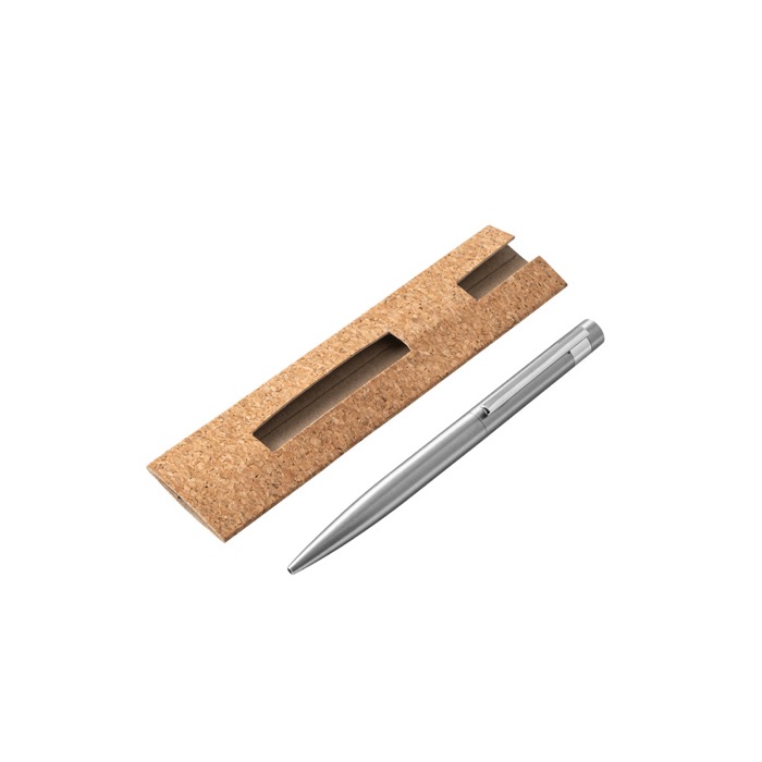 Bolígrafo de acero inoxidable, fabricado con un 53% de material reciclado, que combina elegancia y sostenibilidad. Su diseño incluye un práctico clip y un mecanismo giratorio que facilita su uso diario. La tinta azul asegura una escritura fluida y profesional, ideal para cualquier entorno de trabajo. Se presenta en una bolsa de regalo de corcho, añadiendo un toque distintivo y ecológico. Además, cuenta con un servicio Express para entregas rápidas. Perfecto para empresas que buscan un artículo promocional que refleje su compromiso con la sostenibilidad y que deseen destacar su marca en eventos corporativos.