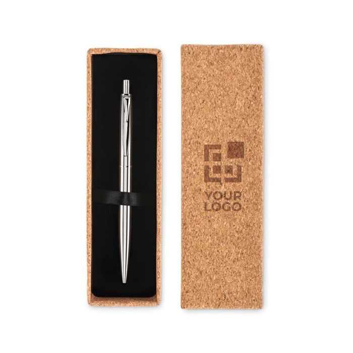 Bolígrafo de acero reciclado con presentación en caja de corcho para impresionar a tus socios comerciales