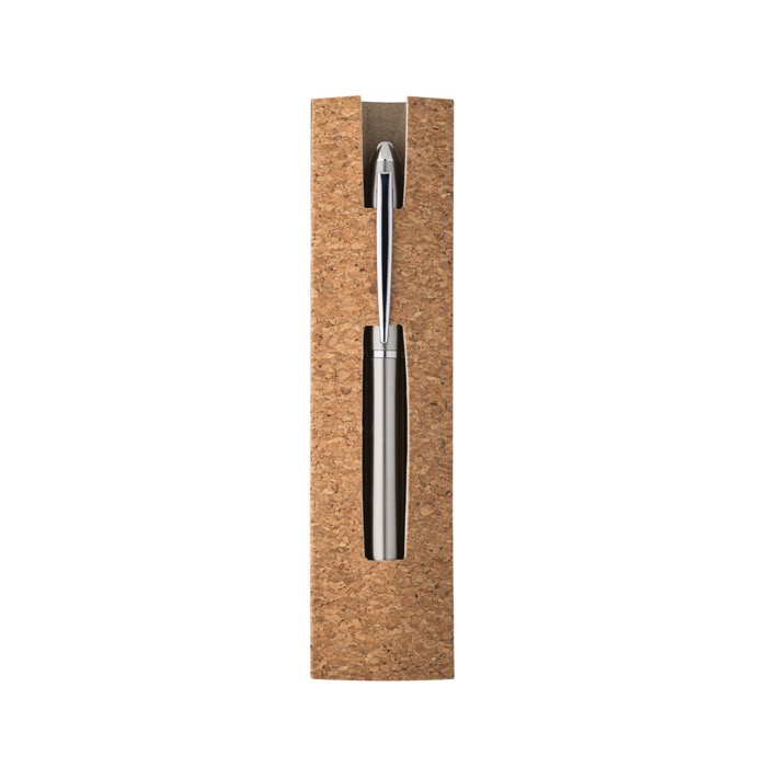 Bolígrafo de acero inoxidable con mecanismo giratorio y presentación premium en bolsa de corcho