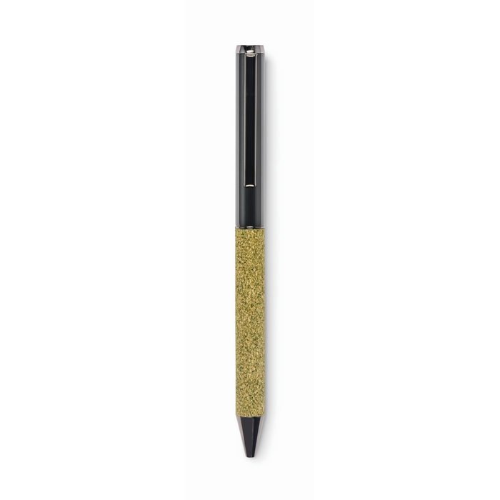 Bolígrafo de metal giratorio con un cuerpo único que combina tela y materiales sostenibles. Fabricado con un 20% de posos de té, un 30% de corcho y un 50% de tela de poli algodón, este bolígrafo ofrece una experiencia de escritura suave y cómoda. La tinta azul garantiza una escritura clara y profesional, ideal para cualquier entorno de trabajo. Presentado en una elegante caja de cartón, es una opción práctica y ecológica para empresas que buscan integrar productos sostenibles en su día a día. Perfecto para reuniones, conferencias o como parte de un kit de bienvenida corporativo.