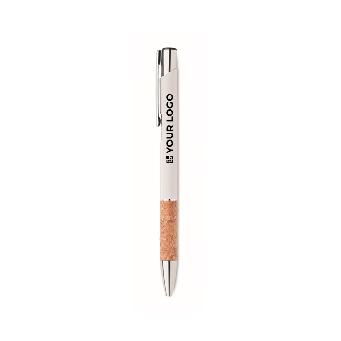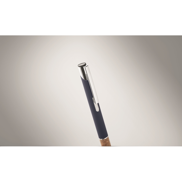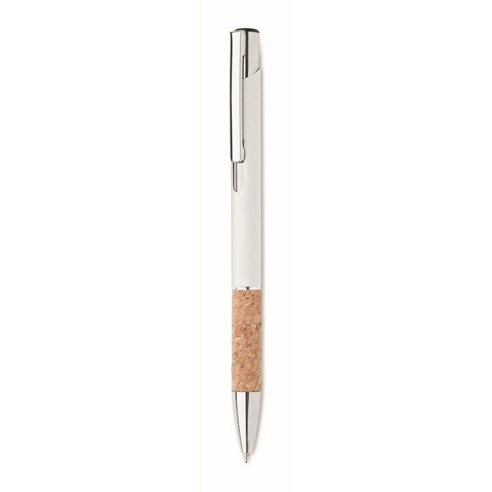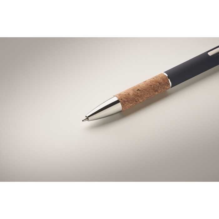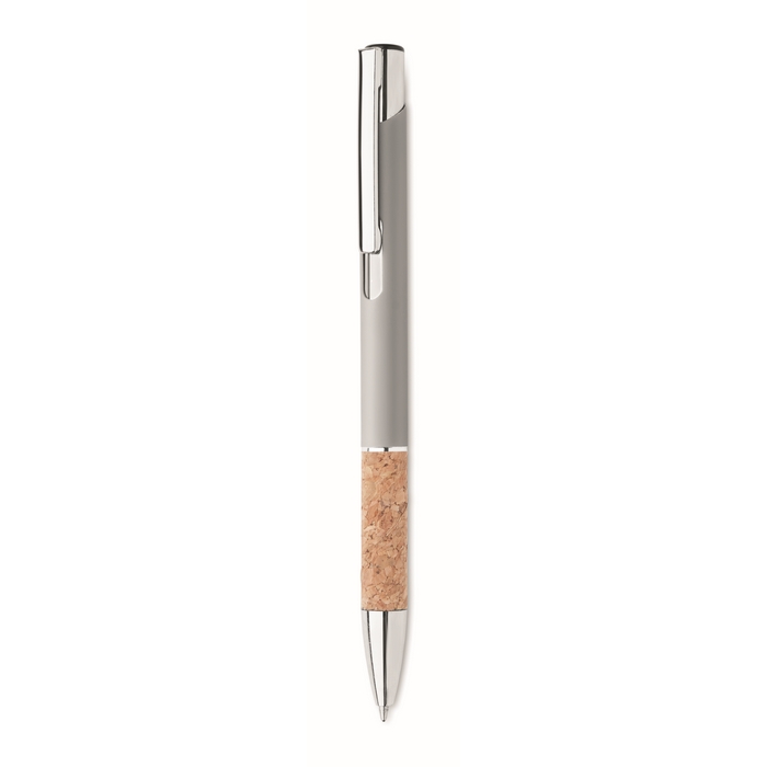 Bolígrafo con pulsador de aluminio y empuñadura de corcho, diseño sostenible y cómodo, tinta azul, perfecto para negocios responsables y usuarios conscientes.