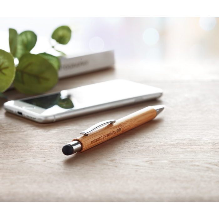 Bolígrafo promocional en bambú con puntero táctil y tinta azul