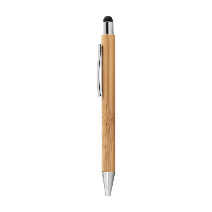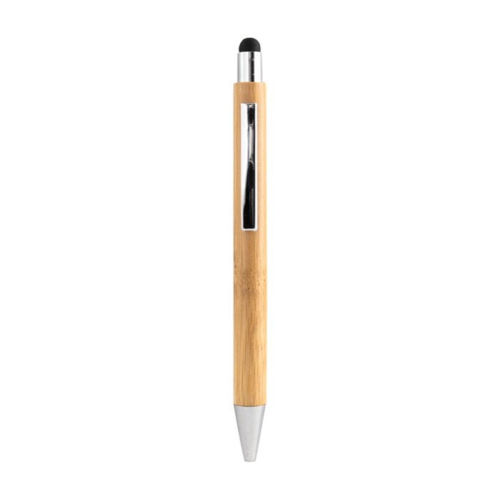 - Bolígrafo de bambú con puntero táctil y acabado cromado