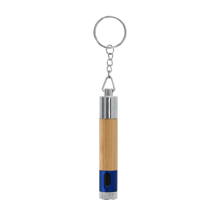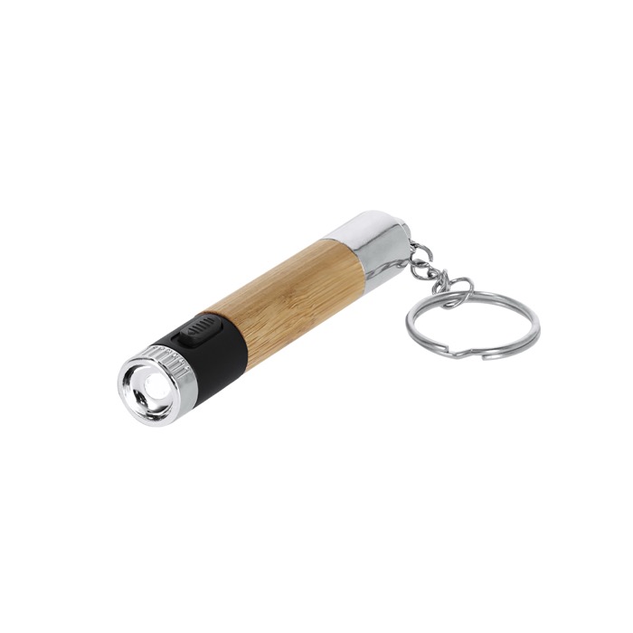 Bolígrafo de bambú con linterna LED integrada, pensado para combinar escritura y luz puntual en el día a día. Incorpora capucha con anilla metálica cromada, útil para colgarlo o llevarlo junto a llaves y acreditaciones. La escritura es en tinta azul, adecuada para uso de oficina y recepción. Funciona con pilas de botón incluidas, para que llegue listo para entregar. Recomendado como detalle corporativo en ferias, acciones de captación o formaciones internas.