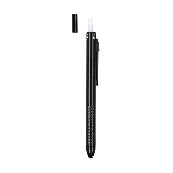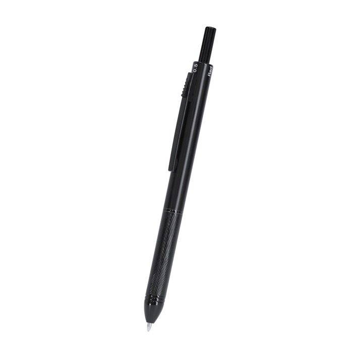Bolígrafo portaminas 4 en 1 de aluminio, diseñado para ofrecer versatilidad y comodidad en un solo instrumento de escritura. Este bolígrafo combina tinta azul, negra y roja, permitiendo cambiar fácilmente entre colores según las necesidades del momento. Además, incluye una función portaminas con una mina de 0,5 mm, ideal para anotaciones precisas. La goma integrada en el pulsador facilita correcciones rápidas, mientras que la empuñadura ergonómica asegura un agarre cómodo durante largas sesiones de escritura. El clip metálico a juego permite llevarlo fácilmente en el bolsillo o cuaderno. Perfecto para oficinas que buscan optimizar el espacio y la funcionalidad en sus herramientas de escritura.