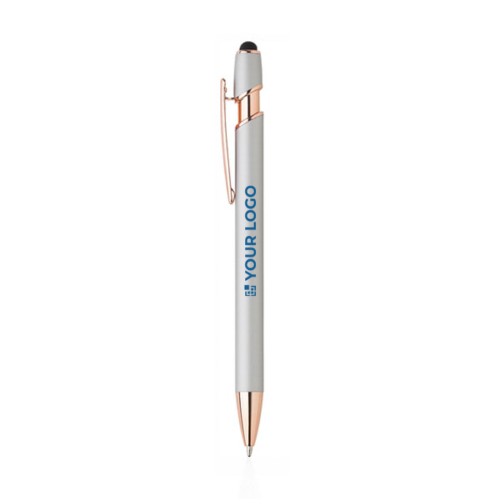 Bolígrafo de aluminio con detalles en oro rosa y puntero táctil. Este elegante instrumento de escritura combina un diseño moderno con funcionalidad práctica. La tinta azul garantiza una escritura suave y clara, ideal para cualquier entorno de trabajo. Sin embalaje individual, es perfecto para compras al por mayor, facilitando su distribución en eventos corporativos o como parte de un kit de bienvenida. Además, el servicio Express asegura una entrega rápida, ideal para necesidades urgentes. Úsalo como un regalo corporativo que destaca por su estilo y utilidad, o como parte de una estrategia de marketing que refuerce la imagen de marca.