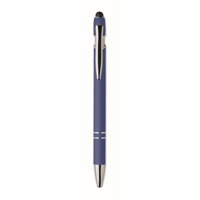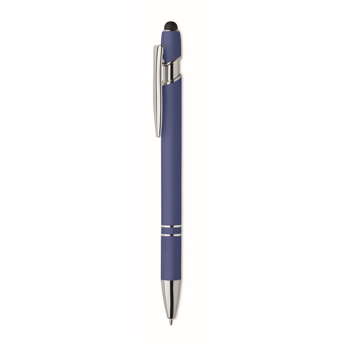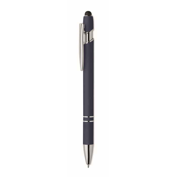 Bolígrafo de aluminio reciclado con acabado gomoso y tinta azul para un uso diario cómodo en oficina o eventos. El cuerpo metálico ofrece una sensación firme en la mano y el recubrimiento suave mejora el agarre en escrituras largas. La tinta azul facilita una lectura clara en notas, formularios y documentación interna. Formato práctico para llevar en reuniones, ferias o visitas comerciales. Recomendado como soporte de marcaje en acciones corporativas, packs de bienvenida y campañas de captación.