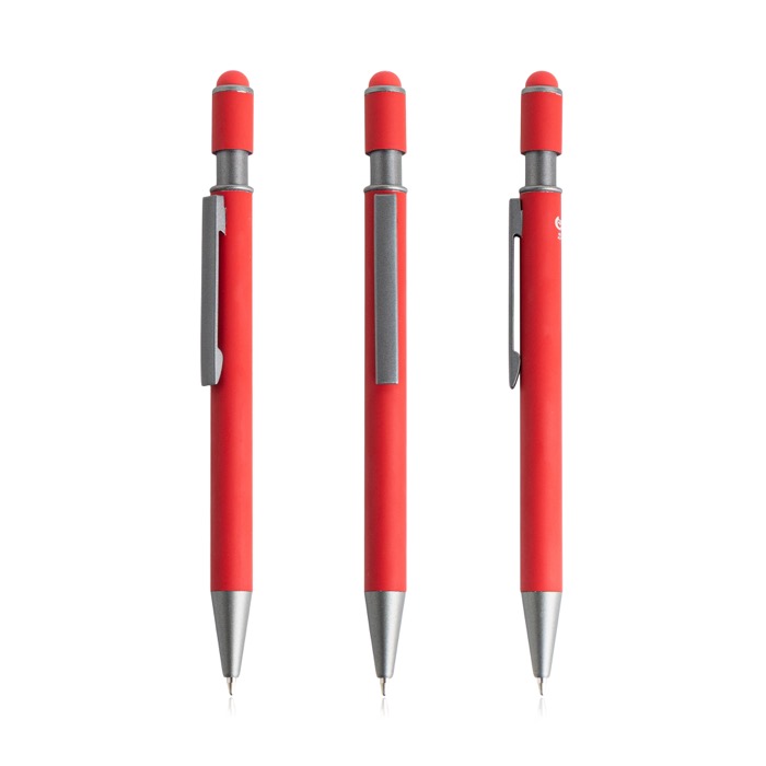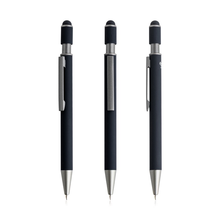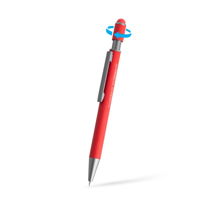 Bolígrafo con acabado engomado, puntero táctil y spinner integrado. Dejad que vuestro logo acompañe reuniones y visitas comerciales con un detalle útil y memorable.