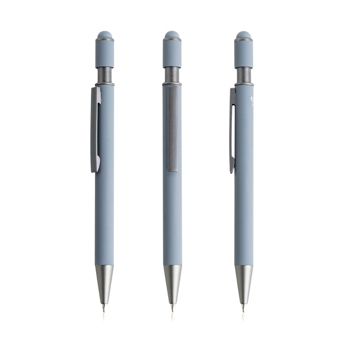 Bolígrafo de aluminio reciclado con acabado engomado, pensado para un uso cómodo en el día a día. Incorpora mecanismo de pulsador para un manejo rápido y punta superior táctil, útil para interactuar con pantallas sin dejar huellas. Incluye un spinner integrado que ayuda a mantener las manos ocupadas en reuniones o llamadas. Escribe con tinta azul y mantiene una línea consistente. Una opción práctica para acciones de marketing, ferias o como detalle corporativo en oficina.