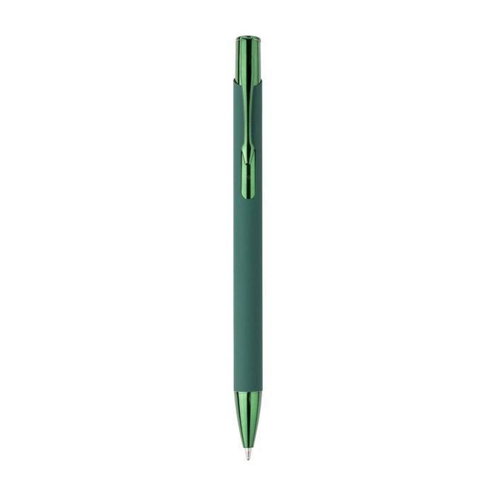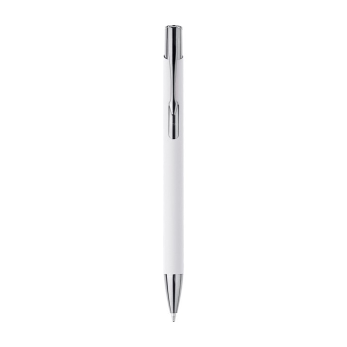 Bolígrafo de aluminio reciclado y goma con pulsador de plástico con acabado UV brillante, punta cromada y clip metálico con revestimiento UV a juego. El marcaje por grabado a láser deja el logotipo con un efecto espejo brillante, pensado para que tu imagen destaque en el uso diario. Ofrece una escritura aproximada de 800 metros con tinta azul y se entrega en bolsa de plástico individual. Una opción práctica para acciones de marketing, ferias y material corporativo de oficina.