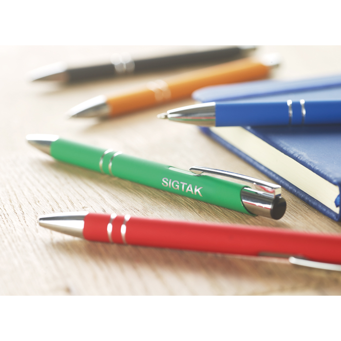 Sorprende a tus clientes con este bolígrafo de pulsador, uno de nuestros best-sellers. Su cuerpo de aluminio, recubierto de goma color mate, ofrece una experiencia de escritura cómoda, mientras que las puntas y el clip metálicos añaden un toque de sofisticación. Tinta azul para escribir en cualquier documento. Este artículo no solo destaca por su diseño atractivo, sino que también está disponible con transporte rápido. Personaliza estos bolígrafos mediante grabado láser para crear un aire formal que lanzará un mensaje sobre la profesionalidad de tu empresa.