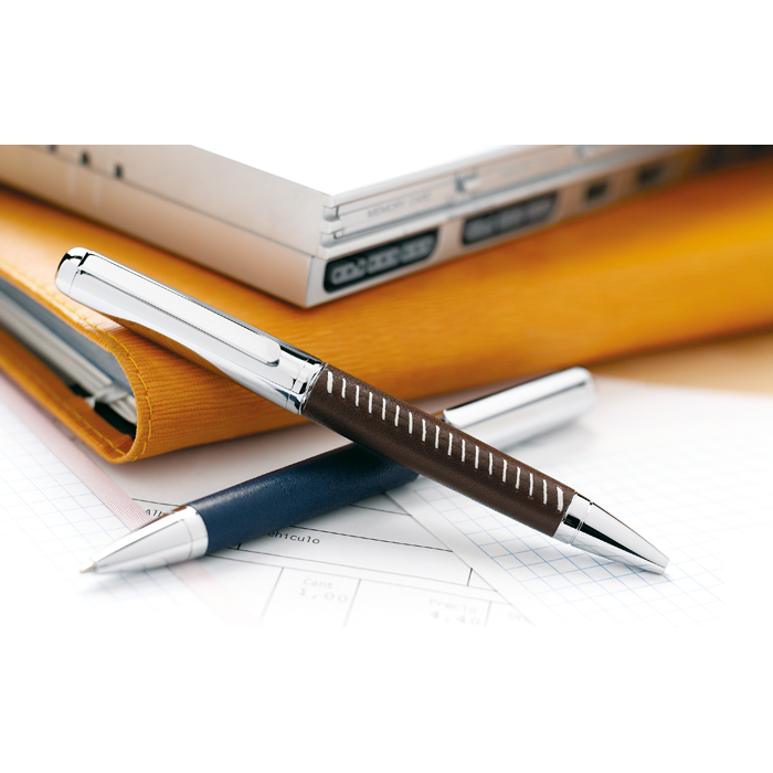 Bolígrafos de metal que tienen un acabado cromado plateado, lo cual les da esa especificación estética atractiva y elegante. De esta forma, se estará entregando un obsequio que se asociará a un producto de calidad, indicando así el cuidado al cliente o a la persona que lo reciba. Como característica complementaria, viene en una caja de tubo de aluminio con aplicación en piel, facilitando así su protección. La tinta es de color negro. En cuanto a las opciones de personalización, este merchandising permite no solo poder poner el logotipo en la superficie del mismo (a uno o varios colores o con láser) sino, también, es posible hacer un grabado en la propia caja, permitiendo así que este accesorio se identifique rápidamente con la empresa que lo entregó, tanto si está guardado como si está fuera de la misma.
