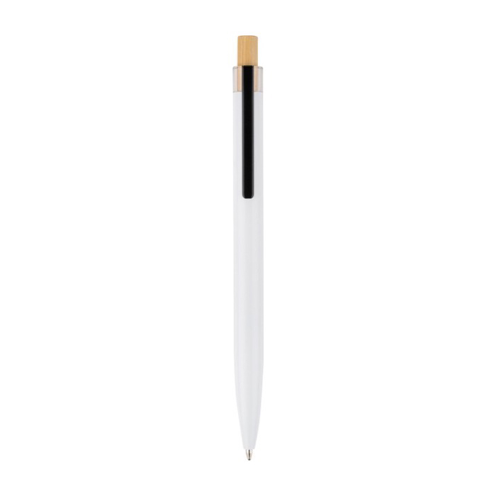 Bolígrafo de aluminio reciclado lacado con pulsador de bambú, adorno de plástico reciclado y clip de metal para un uso diario cómodo en oficina. Incluye logotipo de reciclado grabado a láser y ofrece una escritura aproximada de 700 metros con tinta azul, útil para jornadas largas, formaciones o recepción. Se suministra en bolsa de plástico para facilitar la entrega en acciones de empresa. Opción práctica para personalizar y utilizar en ferias, eventos internos o campañas de marca.