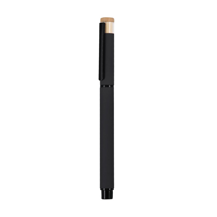 Roller de bambú y aluminio reciclado con cuerpo de acabado gomoso para un agarre cómodo en el uso diario. Incorpora clip y empuñadura en color negro, cierre mediante capucha y cartucho jumbo con tinta de escritura azul para trazos continuos. Incluye distintivo del material reciclado integrado en el diseño, aportando un toque diferencial sin recargar el conjunto. Adecuado para acciones de papelería corporativa, eventos, formaciones internas o como detalle en visitas comerciales con tu logo.