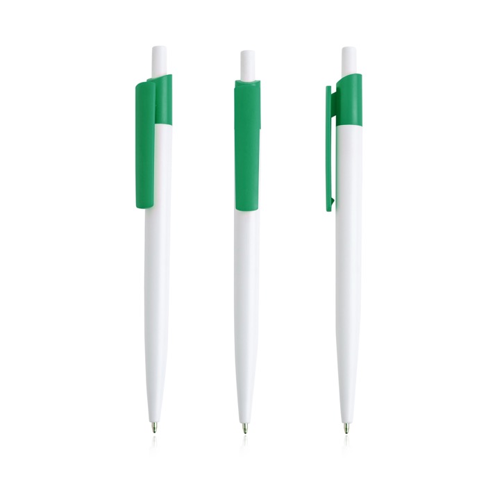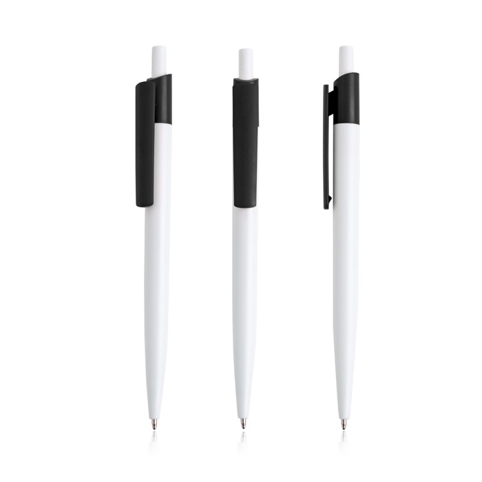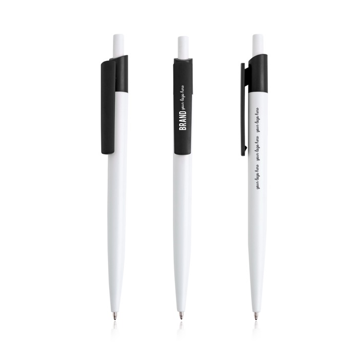 Al elegir un bolígrafo en plástico reciclado, muestras que tu marca aprecia la sostenibilidad y la eficacia. Su diseño moderno, con un clip ancho de color y cuerpo blanco, destaca visualmente. Este bolígrafo, fabricado en ABS reciclado, utiliza un sistema de pulsación para una escritura fluida en tinta azul. Es un regalo práctico para eventos o como parte de tu merchandising. Al incluir tu logotipo, obtienes gran visibilidad y asocias tu empresa con responsabilidad ecológica y estilo, generando una percepción positiva.