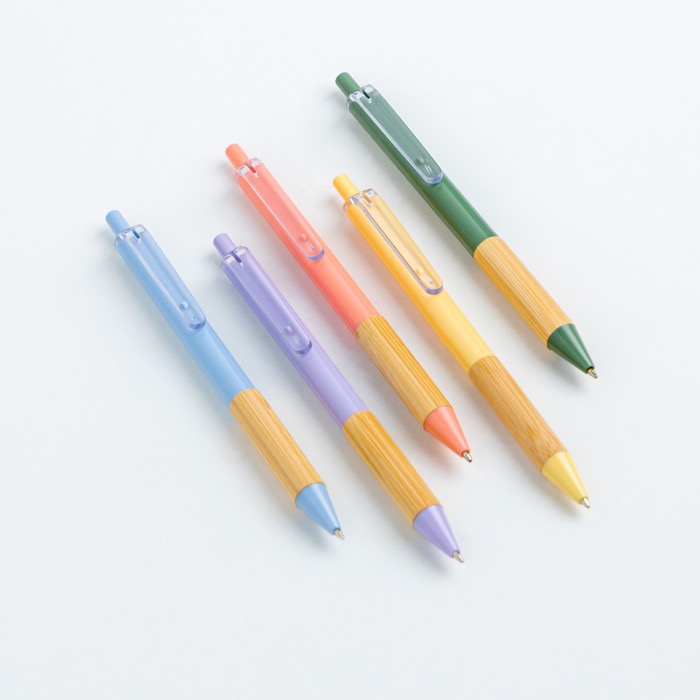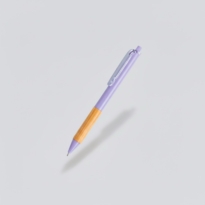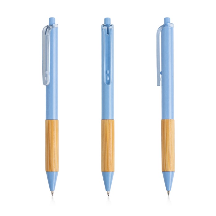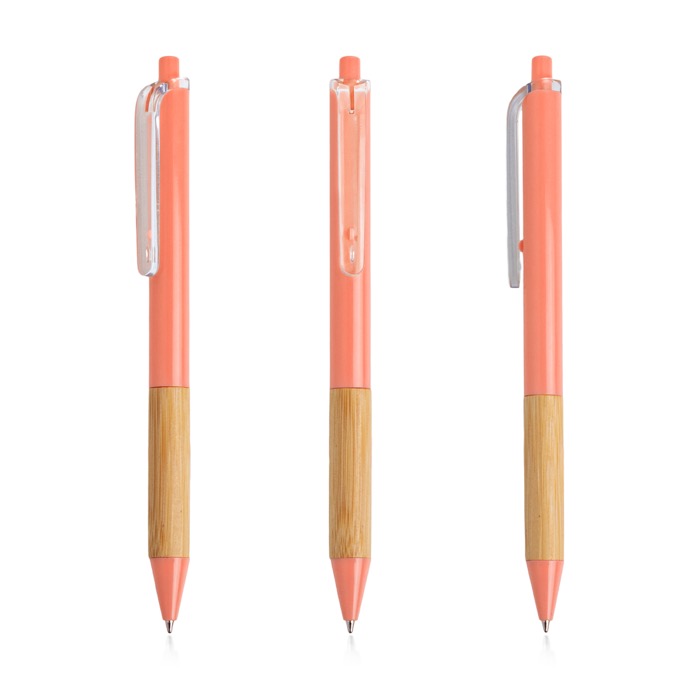 Bolígrafo de plástico reciclado con clip translúcido y zona de agarre en bambú, pensado para el uso diario en oficina. Incorpora mecanismo de pulsador para escribir y guardar la punta con rapidez, y utiliza tinta negra para notas claras y consistentes. Su construcción ligera facilita llevarlo encima y repartirlo en volumen, manteniendo buena resistencia en el tiempo. Disponible en varios colores para adaptarlo a campañas o departamentos. Recomendado como artículo de apoyo en ferias, formaciones internas y acciones de branding con logo.