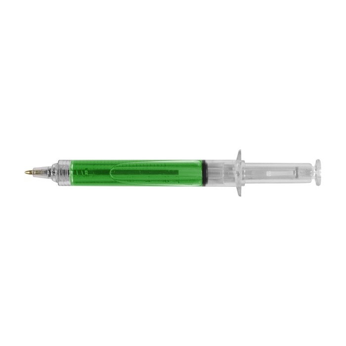 Bolígrafo de AS en forma de jeringuilla, diseñado para simular instrumentos médicos. Presenta un líquido en su interior que puede ser transparente, azul, verde o rojo, lo que lo hace visualmente atractivo. La tinta negra garantiza una escritura clara y profesional. Además, cuenta con un servicio Express para entregas rápidas. Ideal para empresas del sector salud o para campañas de marketing que busquen un toque creativo y distintivo.
