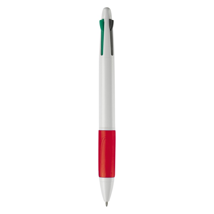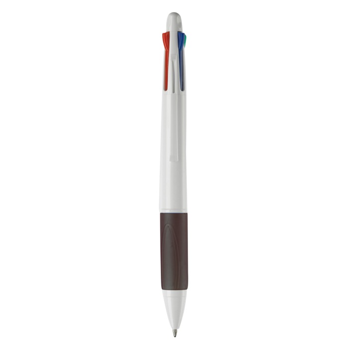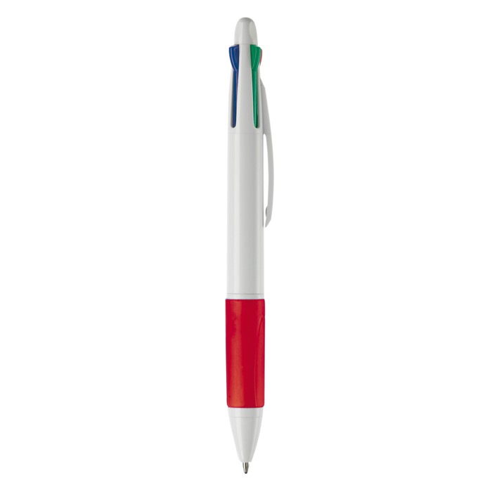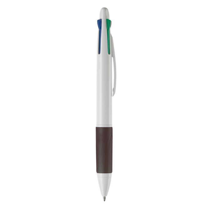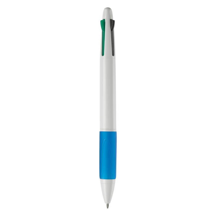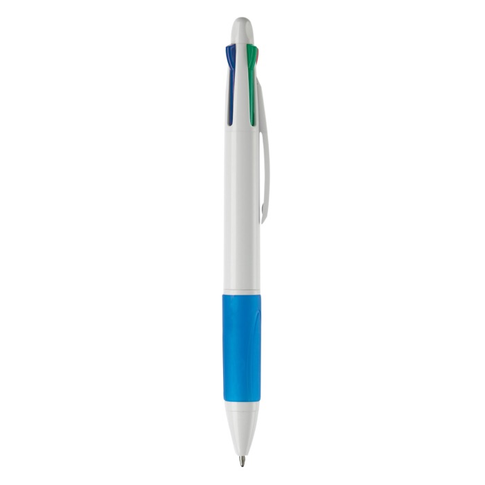 Bolígrafo 4 en 1 blanco fabricado con un diseño elegante y práctico. Ofrece cuatro colores de escritura en un solo instrumento, permitiendo cambiar fácilmente entre tintas según las necesidades del momento. El grip de color proporciona un agarre cómodo, ideal para largas sesiones de escritura. Este bolígrafo es perfecto para oficinas que valoran la eficiencia y el orden, ya que reduce la necesidad de múltiples bolígrafos. Úsalo en reuniones para tomar notas de diferentes temas o en presentaciones para resaltar puntos clave con distintos colores.