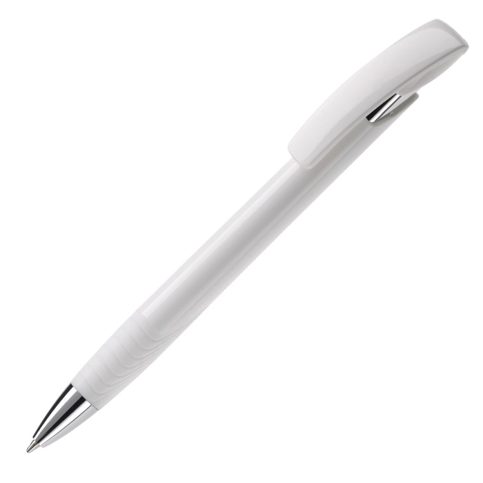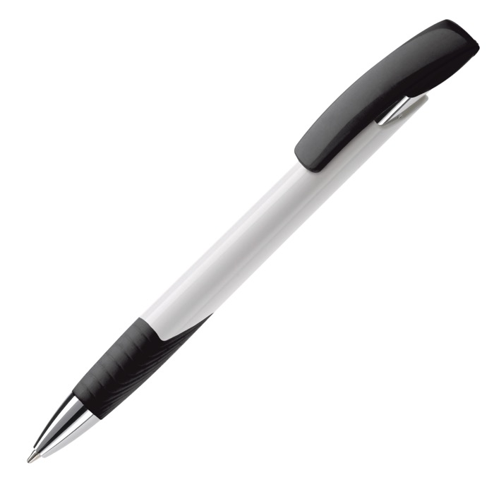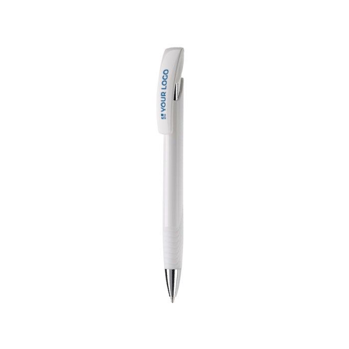 Bolígrafo de plástico y metal con base blanca y detalles a color