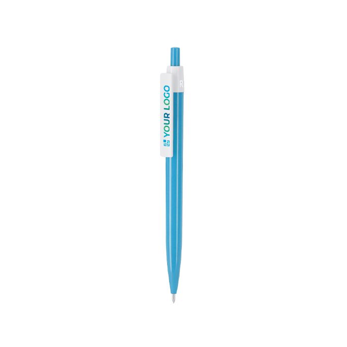Bolígrafo de plástico reciclado con mecanismo pulsador y tinta azul, pensado para un uso diario cómodo en oficina, recepción o visitas comerciales. Incorpora un clip especial diseñado para impresión digital, facilitando un marcaje nítido y visible del logotipo. El cuerpo integra un distintivo RABS (plástico reciclado ABS) en la parte superior como detalle identificativo del material. Opción práctica para acciones de branding en ferias, formaciones o bienvenida de personal.