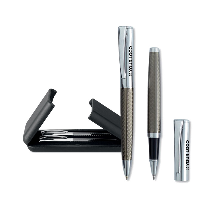 Para captar la atención de tus clientes con un detalle distintivo, un set de bolígrafo y roller con diseño exclusivo es una opción atractiva. Este conjunto, que incluye un bolígrafo giratorio de tinta azul y un roller, se presenta en un estuche personalizable. Tus clientes lo utilizarán en su día a día profesional, en reuniones o en eventos, asegurando una visibilidad constante de tu logotipo. Es un regalo que comunica el cuidado por el diseño y la utilidad, reforzando la conexión con tu marca y proyectando una imagen de empresa que valora la estética y la funcionalidad.