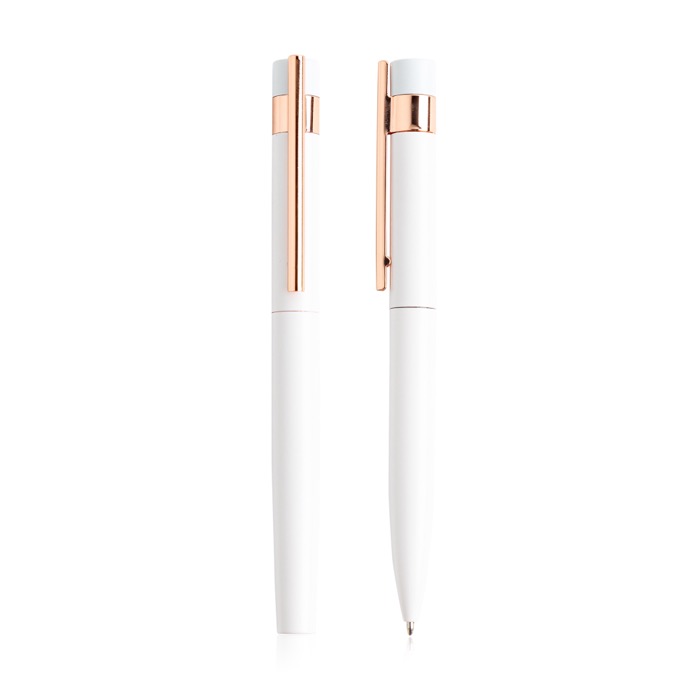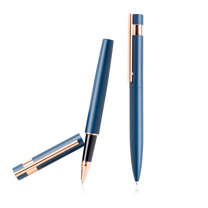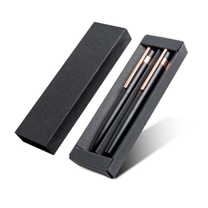 Juego de bolígrafo y roller con detalles en oro rosa tinta negra