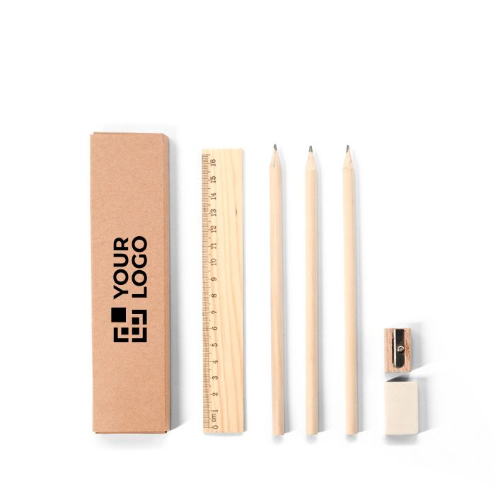Juego de escritura de madera y goma suave (TPR, caucho termoplástico) que reúne lo esencial para el día a día. Incluye 3 lápices redondos afilados de dureza HB, sacapuntas de madera natural, goma de borrar y una regla de pino de 16,5cm con escala en centímetros. Se entrega en una caja de regalo de papel kraft, lista para repartir. Al usar materiales naturales, el tono y el resultado de la impresión pueden variar entre unidades. Adecuado para packs de bienvenida, ferias o formación interna.