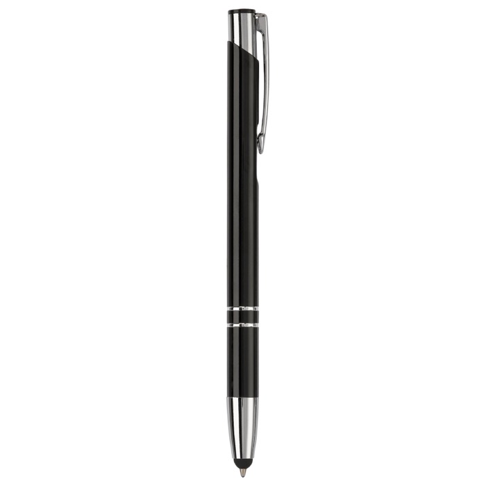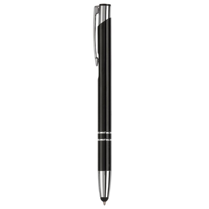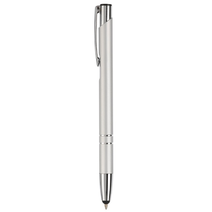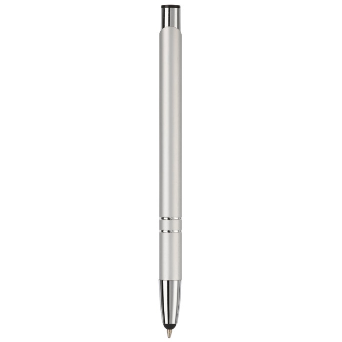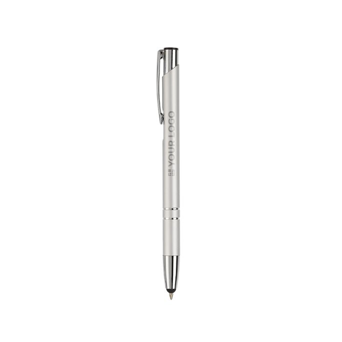 Bolígrafo de aluminio con puntero para pantalla táctil y tinta de escritura azul, pensado para el día a día en oficina y en visitas comerciales. Permite tomar notas con trazo fluido y, a la vez, interactuar con móviles y tablets sin manchar la pantalla. El cuerpo metálico aporta una sensación sólida en mano y una buena presencia en reuniones. Su uso es sencillo y práctico para equipos que alternan entre papel y dispositivos. Recomendado para ferias, formaciones y acciones de branding con logo.