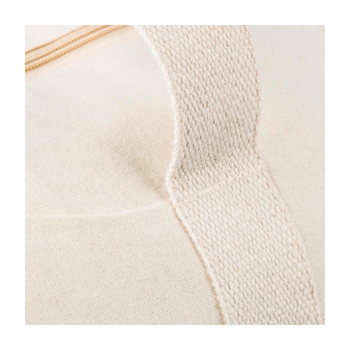 Bolsa deportiva de algodón natural de 180 g/m² con cremallera para mantener el contenido más protegido durante desplazamientos. Incorpora fuelle para ganar capacidad y mejorar la estabilidad al apoyarla. Incluye asas largas de algodón de 60 cm y 5 cm de ancho, pensadas para llevar al hombro con comodidad incluso con carga. Lleva etiqueta Oeko-Tex® (Oeko-Tex: certificado de control de sustancias en textiles) para facilitar la comunicación de estándares textiles. Opción práctica para acciones de marca, eventos deportivos o uso interno en oficina.