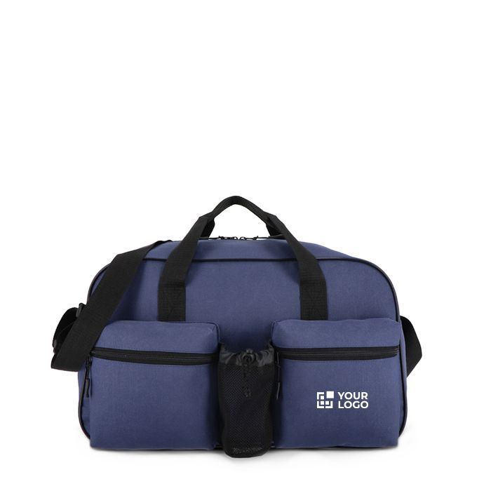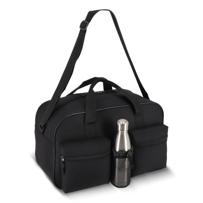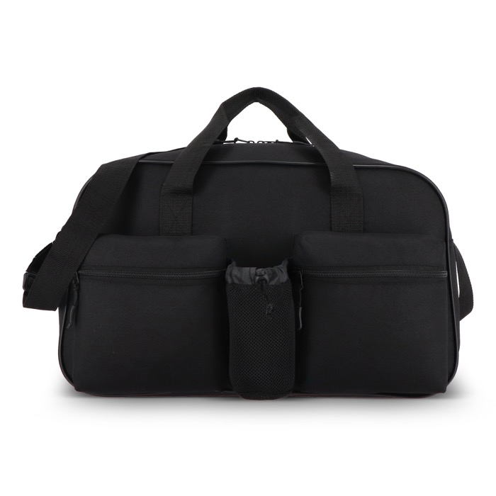 Bolsa deportiva y de viaje de plástico reciclado 600D, pensada para el uso diario en desplazamientos, gimnasio o salidas de trabajo. Combina asas cortas de mano con correa larga ajustable al hombro para adaptarse a diferentes rutinas. Incorpora dos compartimentos frontales con cremallera, útiles para tener a mano llaves, documentación o auriculares, y un bolsillo de malla para llevar la botella separada del resto. Una opción práctica para acciones de marca en eventos deportivos o bienestar corporativo.