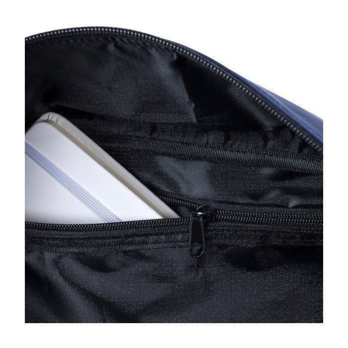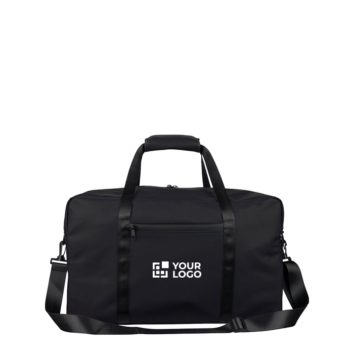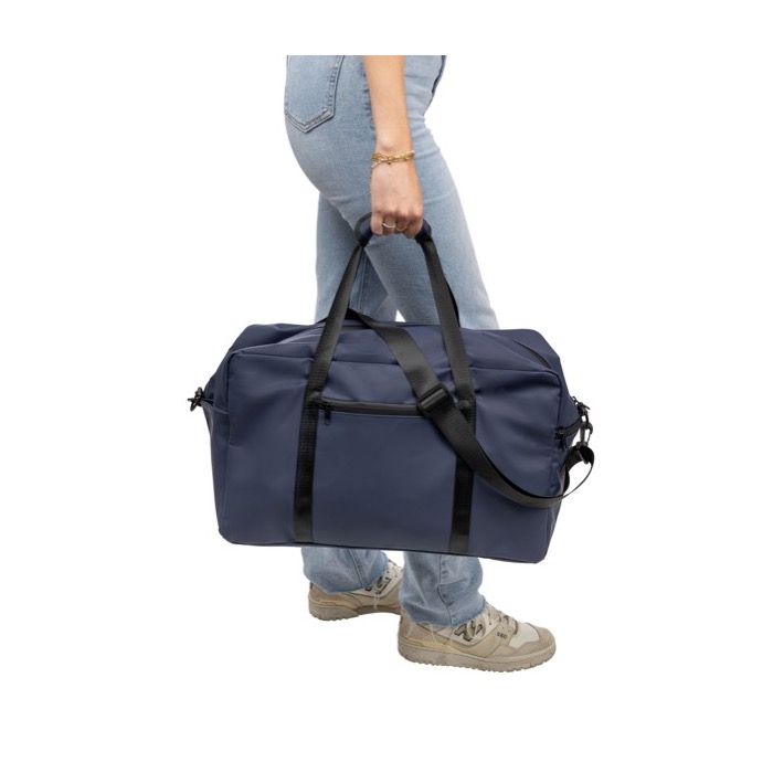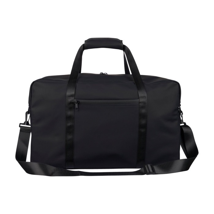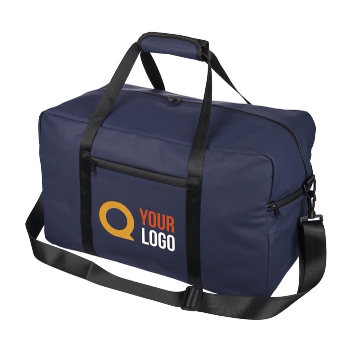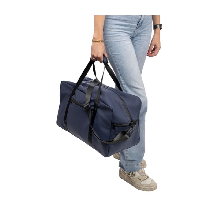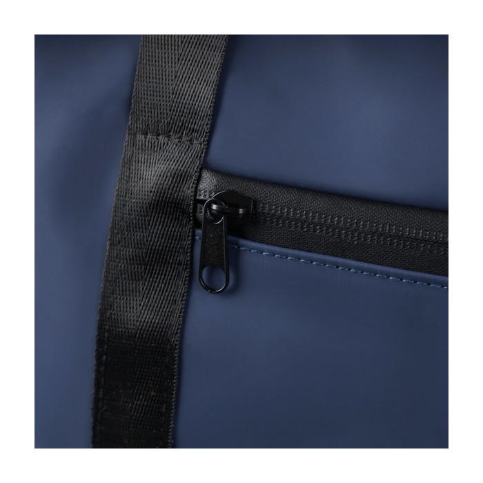 Bolsa deportiva o de viaje de piel sintética reciclada con forro de poliéster reciclado 210D. Incorpora asas largas con cierre de velcro y una cinta de hombro regulable para facilitar el transporte en desplazamientos y eventos. Incluye un bolsillo delantero pequeño con cremallera para objetos de acceso rápido y un compartimento principal amplio, también con cremallera, para mantener el contenido ordenado. Opción práctica para acciones de marca en ferias, equipos comerciales o viajes corporativos.