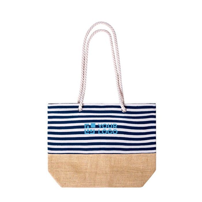 Una bolsa de algodón a rayas con base de yute te permite ofrecer un artículo que combina elegancia y resistencia para tu marca. Fabricada en resistente algodón de 450 g/m2, su robustez garantiza durabilidad. El diseño a rayas blancas y azules y la base de yute le confieren un toque sofisticado. Con un acabado cosido y cierre de cremallera, es un complemento útil para tus clientes, tanto para la playa como para el uso diario. Las asas largas de algodón blanco en forma de cuerda, reforzadas con argollas, soportan hasta 13 kg, asegurando que tu logotipo tenga una visibilidad destacada.