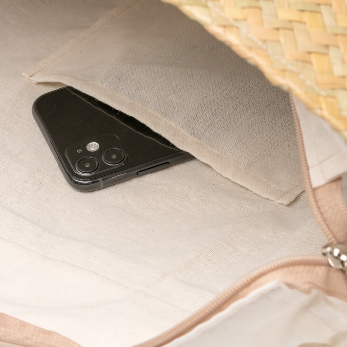 Bolsa de paja con recubrimiento interior de algodón, pensada para el uso diario en entornos urbanos y eventos. Incorpora un compartimento principal amplio con cierre de cremallera para mantener el contenido protegido. Las asas largas de piel sintética facilitan llevarla al hombro y combinan con el acabado exterior. Incluye un bolsillo interno para organizar llaves, móvil o tarjetas, y una zona frontal preparada para aplicar el marcaje. Opción práctica para acciones de marca en ferias, bienvenida a nuevos empleados o regalos corporativos.