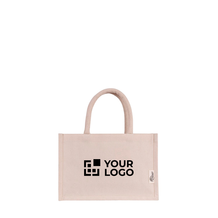 Bolsa de algodón reciclado promocional con base y asa de yute 320 g/m2