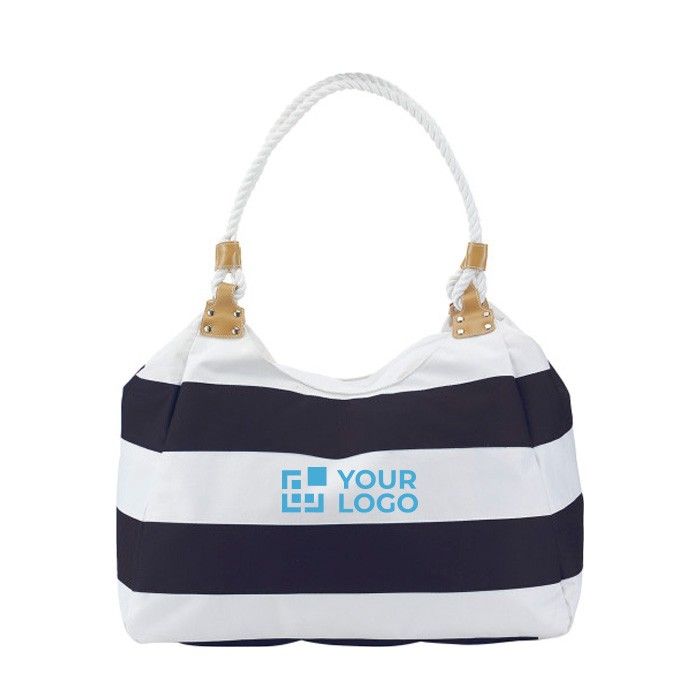Una bolsa de playa de poliéster, con su diseño marinero y bolsillo interior, se convierte en un accesorio distintivo para tus campañas de verano. El compartimento principal y el bolsillo interior, ambos con cierre de cremallera, aseguran que los objetos personales estén protegidos. Puedes ofrecerla a tus clientes para sus jornadas en la costa o piscina, proporcionando un espacio amplio para toallas y objetos personales. El poliéster garantiza resistencia y durabilidad, mientras que el estilo náutico refuerza una imagen de marca fresca y aventurera. Las asas largas facilitan su transporte, aumentando la comodidad. Cada vez que tus usuarios la lleven, tu logotipo ganará visibilidad en entornos de ocio, asociando tu empresa con el buen tiempo y momentos de relajación.