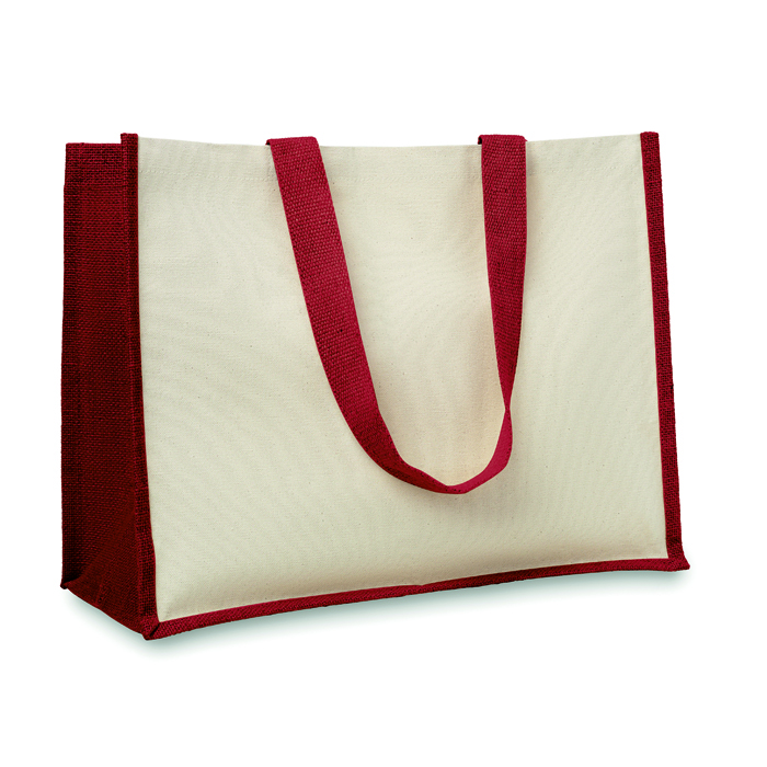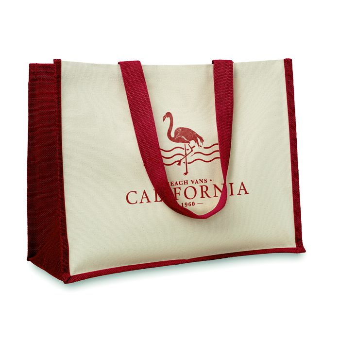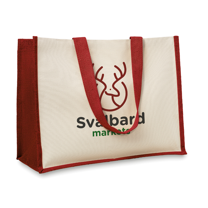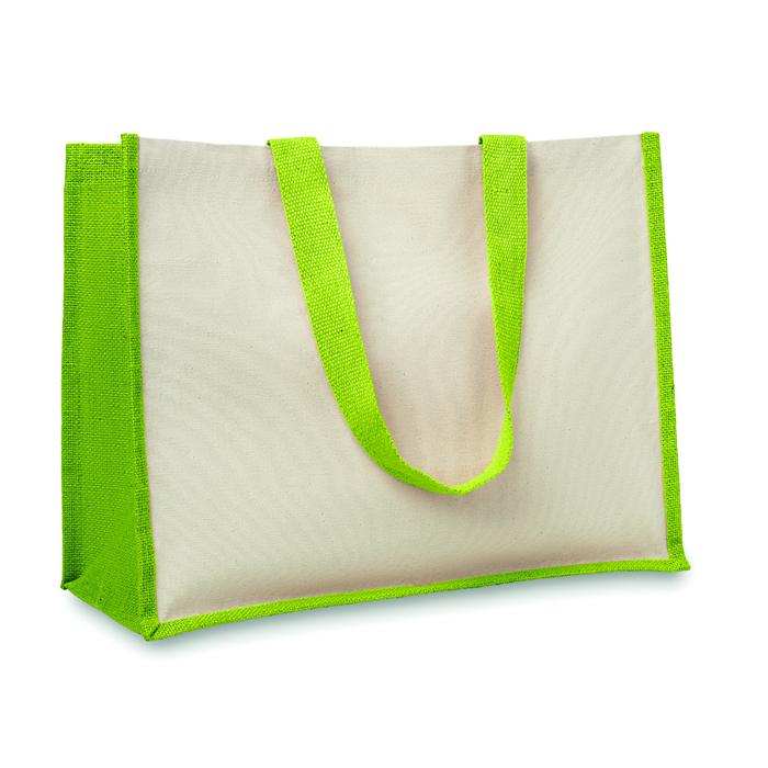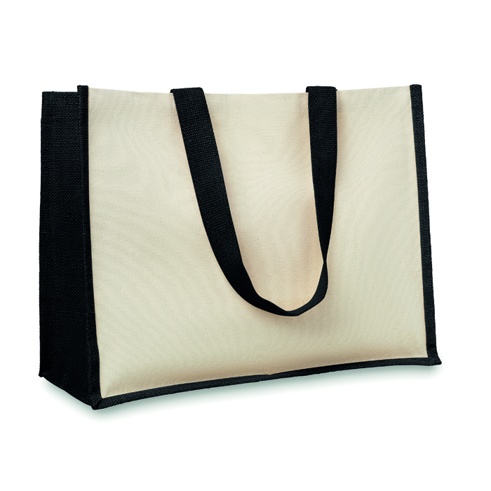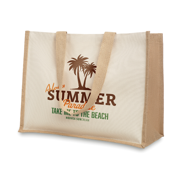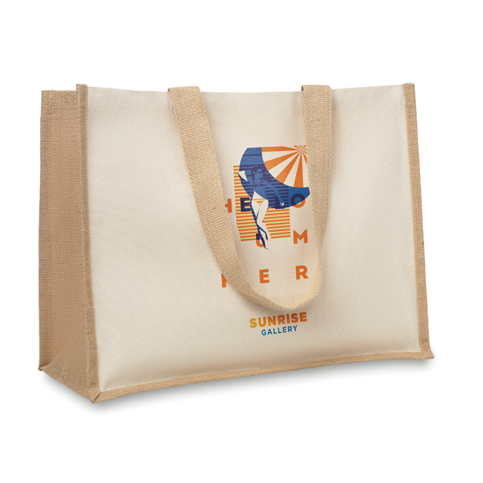 Bolsa de la compra personalizada fabricada en loneta y yute con interior laminado y asas de algodón para acciones de publicidad y marketing a tus clientes.