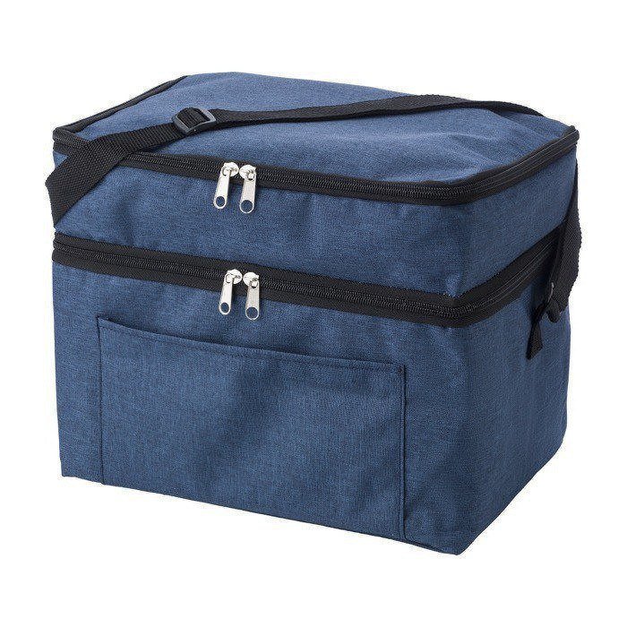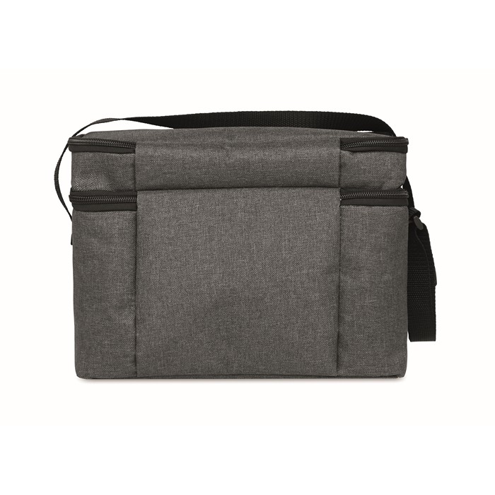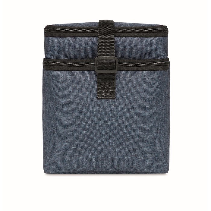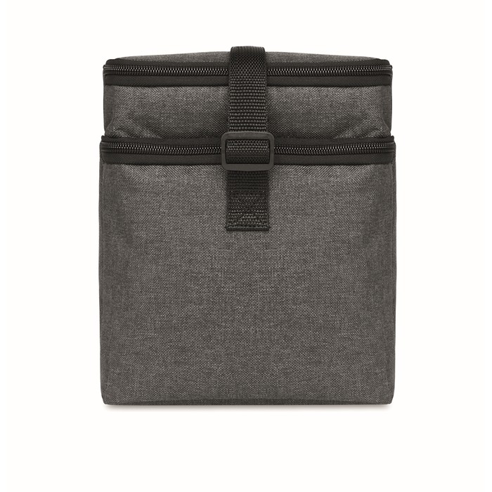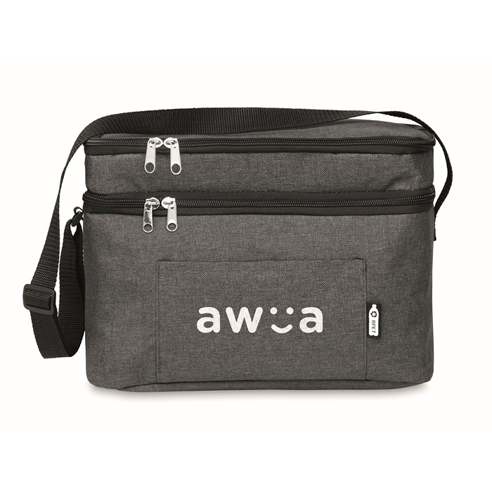 Bolsa nevera fabricada en RPET 600D, diseñada con dos compartimentos para un almacenamiento eficiente. El aislamiento de 0,15 mm de PEVA junto con 3 mm de espuma garantiza que los alimentos y bebidas se mantengan a la temperatura adecuada. Incluye una cinta bandolera ajustable para facilitar su transporte. Este producto es un Bestseller y está disponible con servicio Express, lo que asegura una entrega rápida. Ideal para empresas que buscan ofrecer a sus empleados o clientes una solución práctica para llevar fruta o bebidas en condiciones óptimas. Perfecta para eventos corporativos o como parte de un kit de bienvenida.