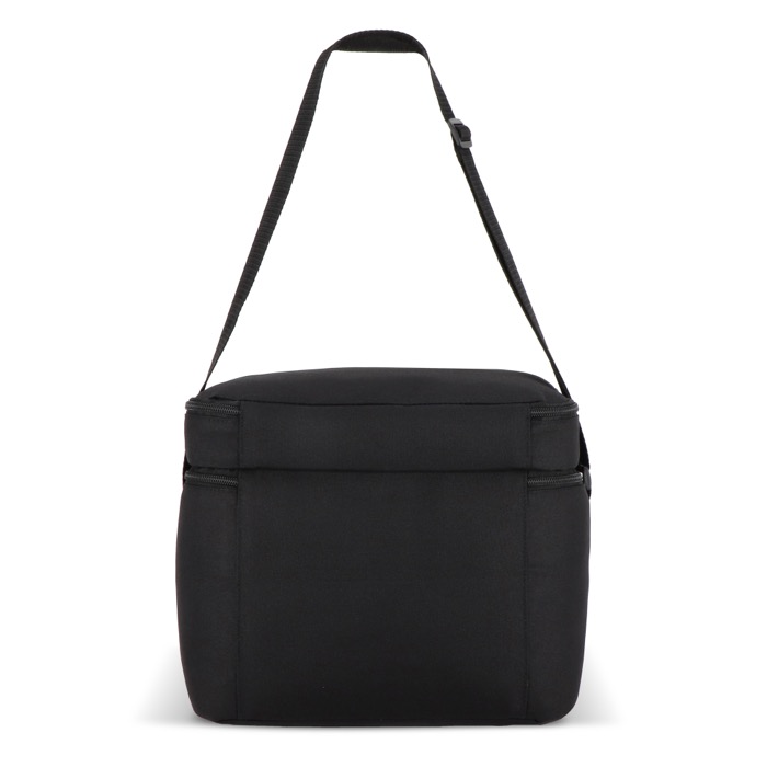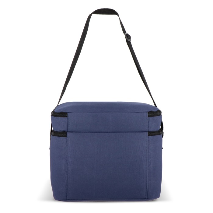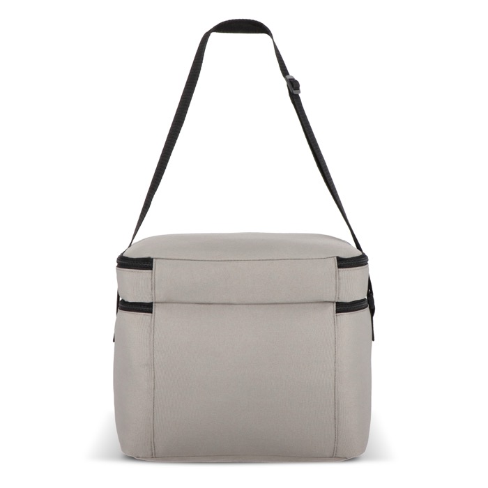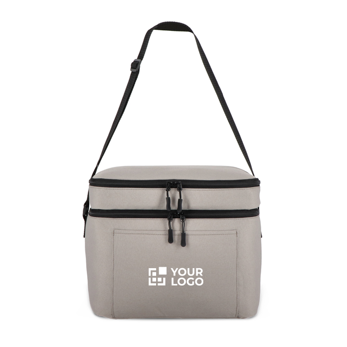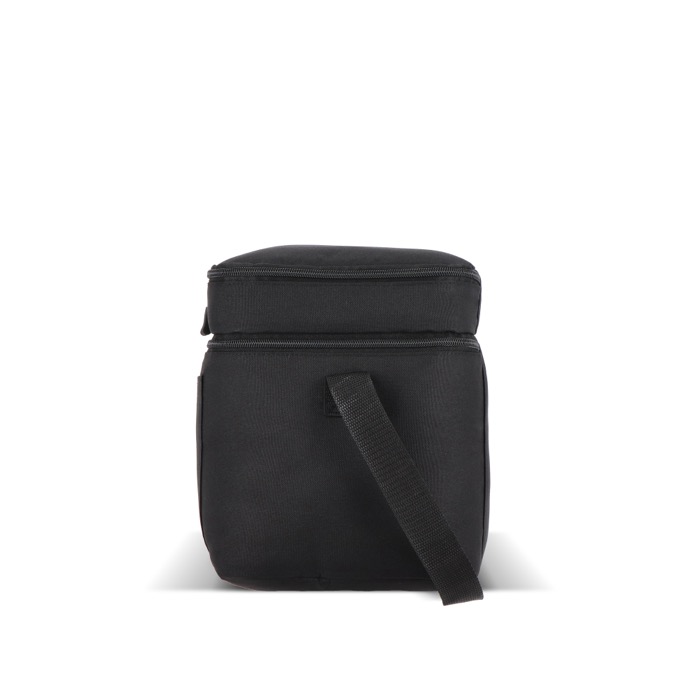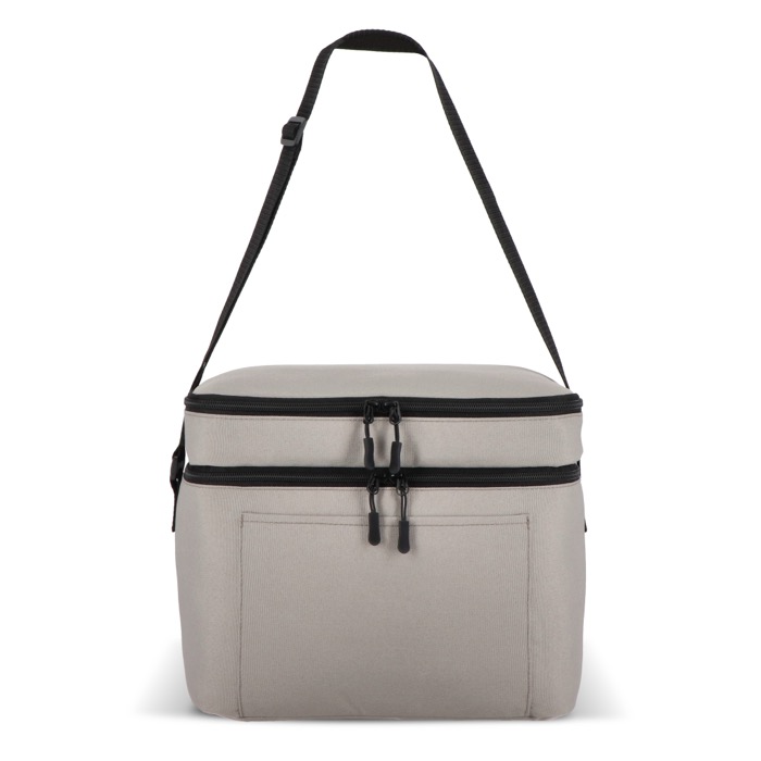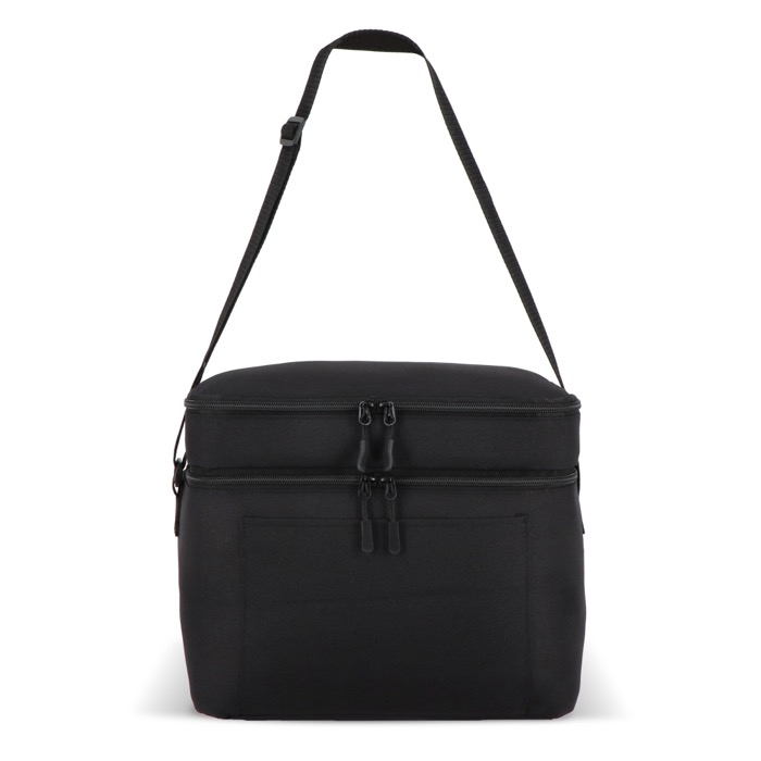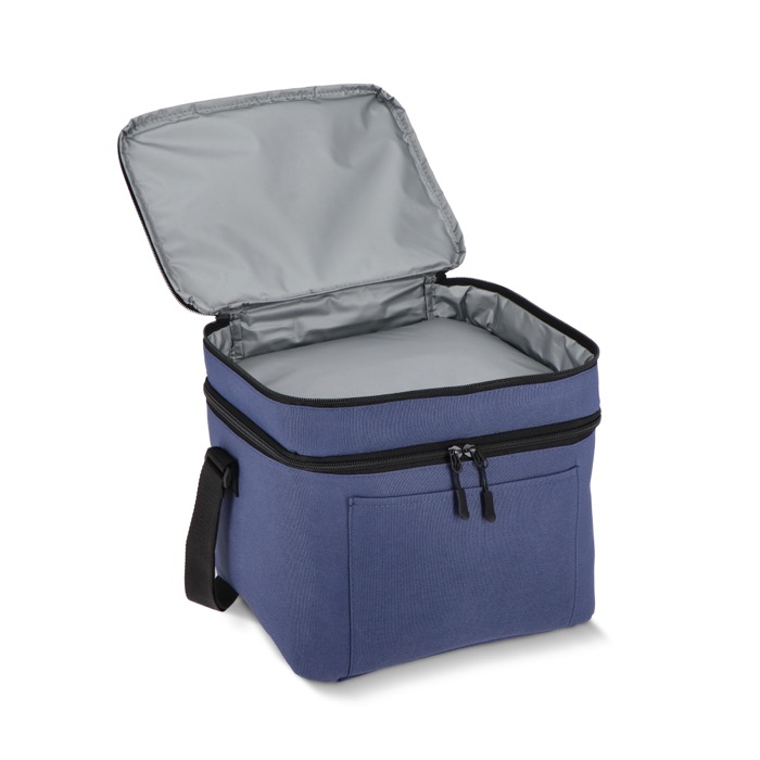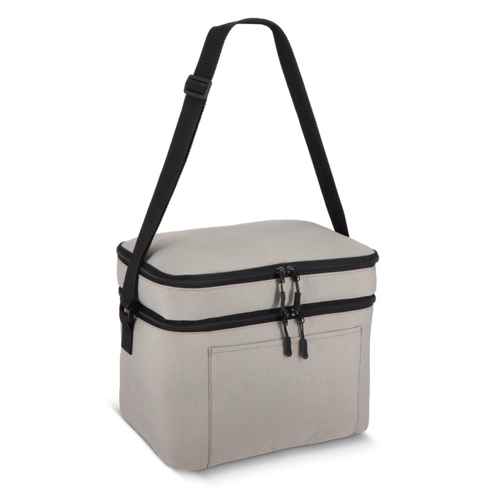 Bolsa térmica de plástico reciclado 600D con doble compartimento para organizar comidas y bebidas sin mezclar temperaturas. El interior aislante de goma suave ayuda a mantener el contenido frío o caliente durante más tiempo y facilita la limpieza diaria. Incluye un compartimento inferior amplio y un bolsillo superior para accesorios, cubiertos o servilletas. Las asas cortas permiten llevarla a mano y la correa de hombro ajustable aporta una alternativa cómoda. Opción práctica para eventos, equipos comerciales o acciones de marca en exterior.