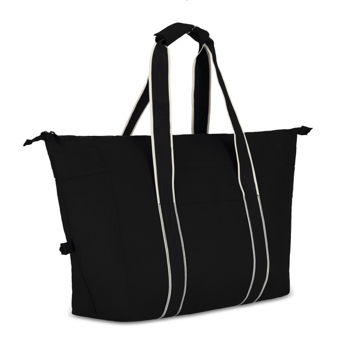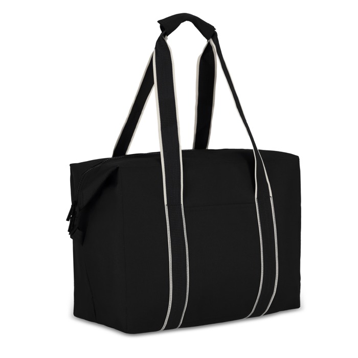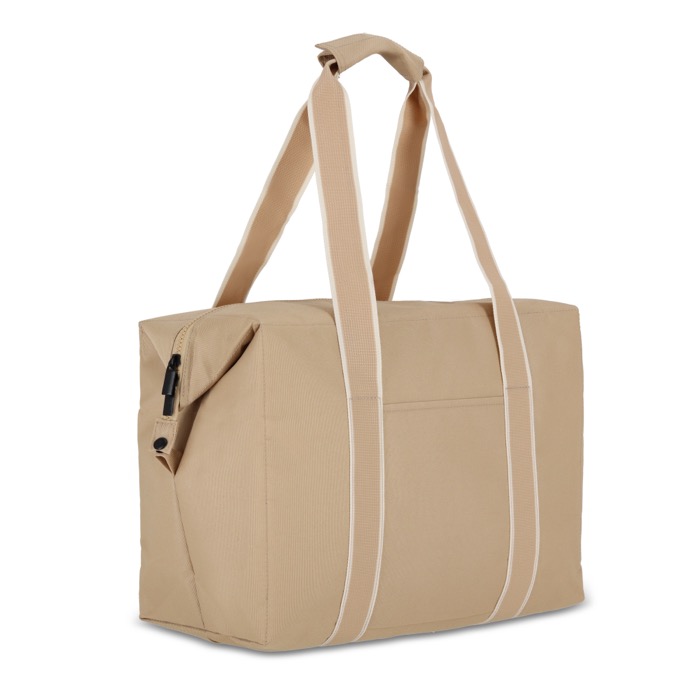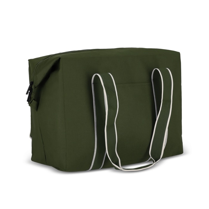 Bolsa isotérmica fabricada con rPET ecológico, un material reciclado que combina sostenibilidad y durabilidad. El amplio compartimento principal cuenta con aislamiento de aluminio, asegurando que los contenidos se mantengan frescos y protegidos durante largos periodos, ideal para picnics, compras o viajes. La cremallera resistente facilita el acceso y garantiza un cierre seguro, preservando la frescura interna. Un bolsillo frontal no aislado ofrece espacio para personalización con logotipos o nombres corporativos, convirtiendo la bolsa en una herramienta promocional efectiva. El diseño permite expandir la capacidad separando los laterales, adaptándose a diversas necesidades empresariales.