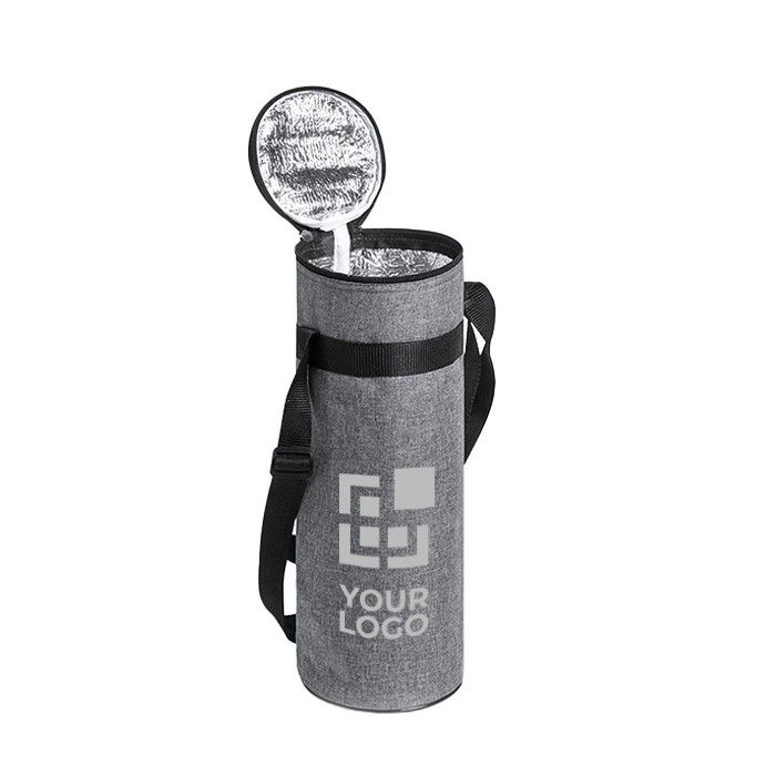 Nevera para botellas de hasta 1,5 litros, fabricada en resistente poliéster 300D RPET. Incluye un cierre de cremallera que asegura un acceso rápido y una cómoda cinta para el hombro ajustable, facilitando su transporte. El interior isotermo de aluminio mantiene la temperatura de las bebidas, ideal para conservar su frescura. La etiqueta con distintivo RPET resalta su compromiso con el medio ambiente. Perfecta para empresas que buscan soluciones sostenibles en eventos corporativos o como parte de un kit de bienvenida para empleados.