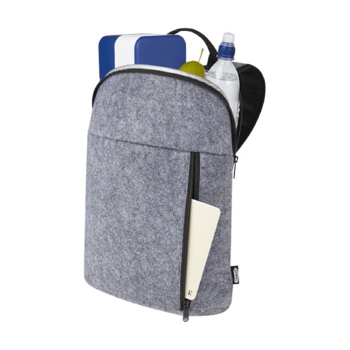 Mochila isotérmica fabricada con fieltro reciclado, certificada por el Global Recycled Standard (GRS). Su compartimento principal, forrado con aislamiento PEVA, mantiene la temperatura de los alimentos, ideal para transportar almuerzos o refrigerios. Incluye un bolsillo frontal con cremallera para acceso rápido a pequeños objetos. Las correas ajustables y el asa de algodón aseguran comodidad en el transporte. Con una capacidad de 7 litros, es fácil de limpiar y no requiere embalaje individual, lo que refuerza su perfil sostenible. Perfecta para empresas que buscan soluciones prácticas y ecológicas para eventos corporativos o regalos promocionales.