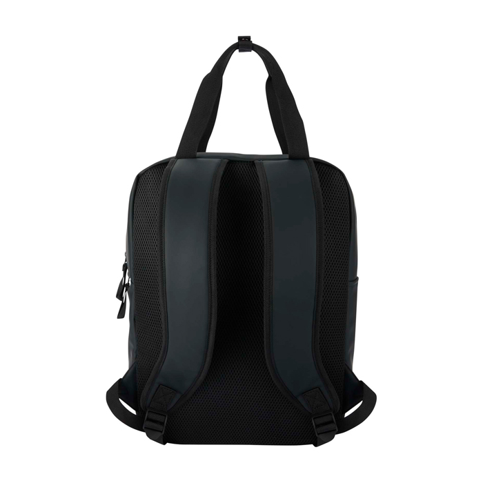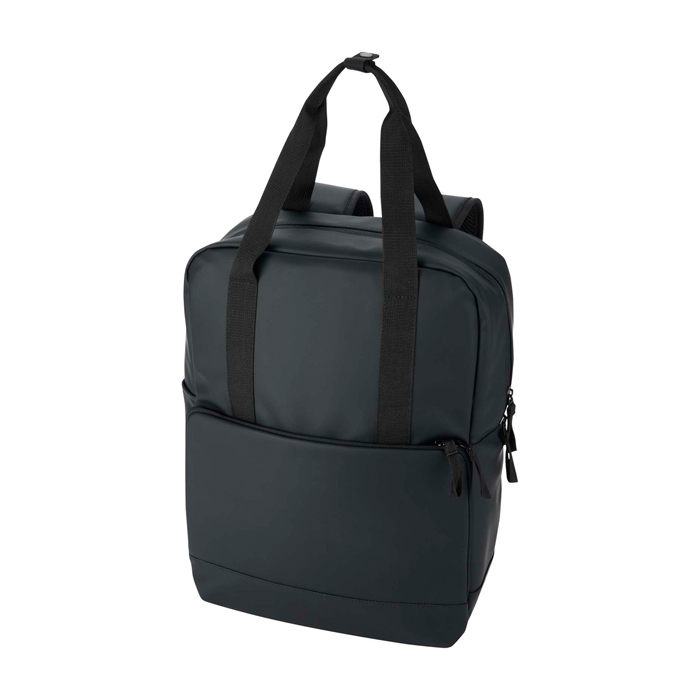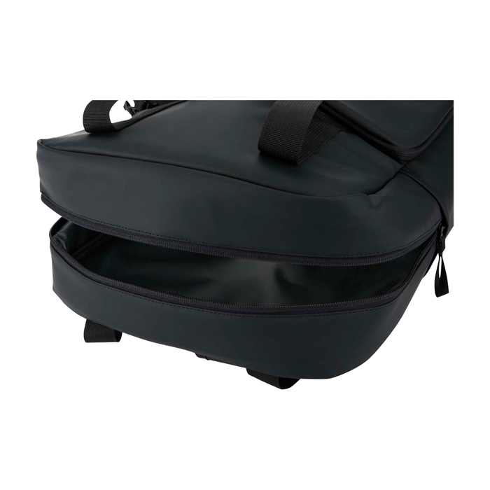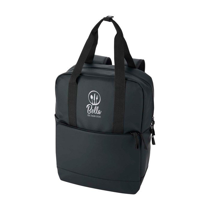 Mochila nevera de piel sintética reciclada con certificado GRS (Global Recycled Standard) y forro de plástico reciclado a juego, pensada para desplazamientos y actividades al aire libre. El compartimento principal aislado ayuda a mantener frías comidas y bebidas, e incorpora trabillas elásticas para sujetar una botella de vino con seguridad. Añade bolsillo frontal acolchado con cremallera para guardar objetos delicados y bolsillo lateral abierto para acceso rápido. La espalda con malla transpirable y los tirantes ajustables mejoran la comodidad. Útil para acciones de marca en eventos, playa o viajes de empresa.
